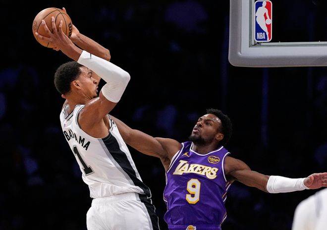 简单回顾比赛,开场文班亚马自投自抢,东契奇三分球回应,瓦塞尔和尚帕尼内外开花。斯马特因故意垫脚吃到一级恶犯,马刺一回合拿到6分!艾顿吃饼+八村塁造杀伤,不过尚帕尼手感火热。中段马刺拉开10分分差,海斯空接炸扣+东契奇单打,尼克史密斯高难度后仰跳投打停马刺。节末双方拉锯,第一节湖人26-29马刺。进入第二节,约翰逊军训布朗尼,卡斯尔造犯规,布朗尼中投命中后,八村塁联合海斯上分。文班亚马晃开八村塁,横跨步起飞战斧劈扣,但也早早3犯被换下场!艾顿连续吃饼,配合东契奇单打,湖人追平!